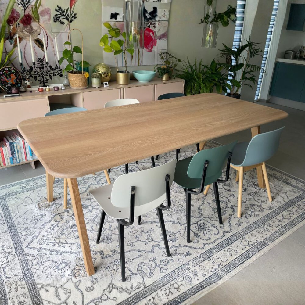 Het resultaat is een karaktervolle, duurzame en unieke tafel, gemaakt van kwalitatief massief hout dat vaak beter is dan het nieuwe hout dat in seriefabricage wordt gebruikt.